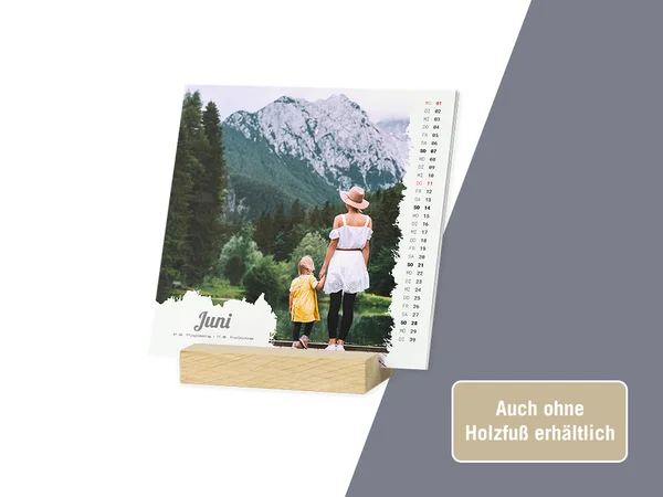 Gestalten Sie Ihren Tischkalender 2026 ganz individuell und erfreuen Sie sich jeden Monat an neuen Bildern. Der Tischkalender kann wahlweise mit hochwertigem Holzfuß oder ohne Holzfuß bestellt werden. Der Holzfuß ermöglicht nicht nur eine elegante und stabile Aufstellung ohne Schrauben oder Wandlöcher, sondern auch ein bequemes Anschauen des Kalenders. Er kann für zukünftige Kalender wiederverwendet werden.