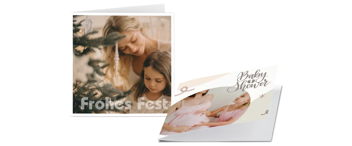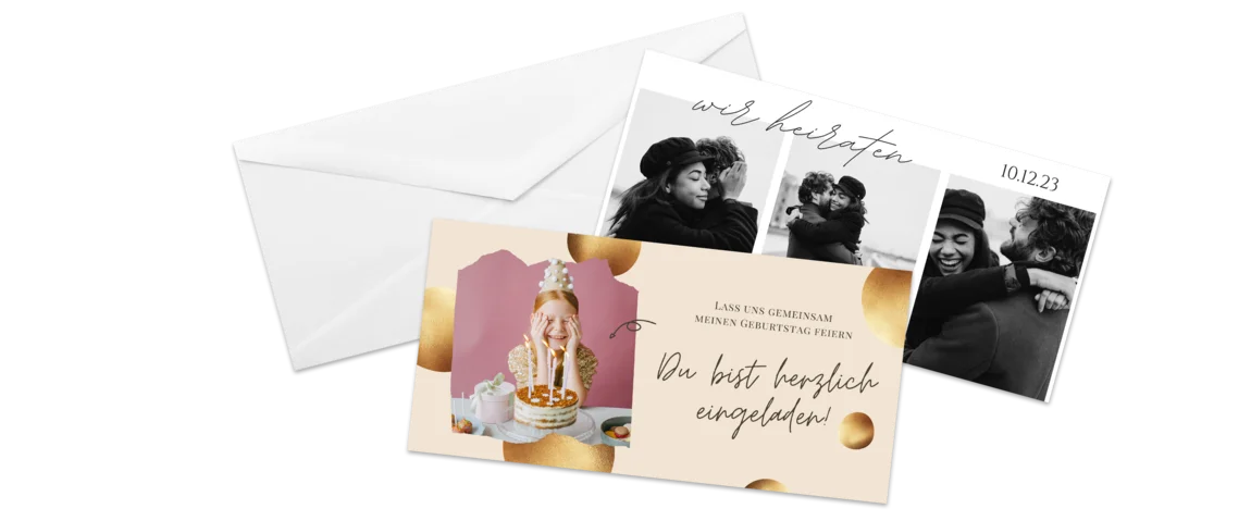 Jahr für Jahr gibt es viele Anlässe, Feierlichkeiten und Momente, die Freunde wie Familie gemeinsam teilen. Um für Geburtstage, die Goldene Hochzeit oder ein Firmenjubiläum eine innovative und einzigartige Karte zu gestalten, finden Sie mit den Fotogrußkarten in unserem Online-Fotoservice unzählige Vorlagen und Designtipps. Sprechen Sie Gäste oder Jubilare in Ihren Grußkarten mit Foto und einer persönlicher Widmung an. Die hohe Papierqualität sorgt auch hier für brillante Ergebnisse und langanhaltende, strahlende Farben. Fotogrußkarten bieten damit für jede Situation das passende Medium. Kombiniert mit persönlichen Glückwünschen und einem individuellen Text bleiben Ihre Grußkarten lange im Gedächtnis.